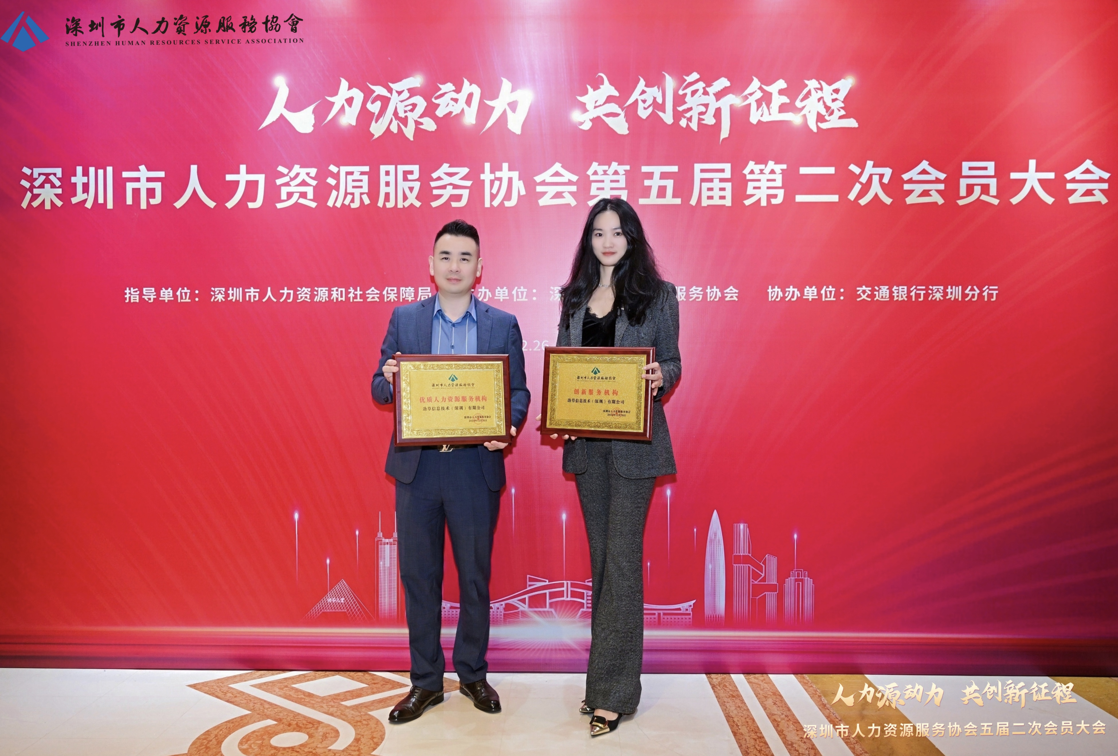 12月26日下午,由深圳市人力资源保障局指导,深圳市人力资源服务协会主办的“深圳市人力资源服务协会第五届第二次会员大会”在威尼斯英迪格酒店隆重举行,劲草信息技术(深圳)有限公司(以下简称“劲草信息”)凭借卓越的服务质量和行业影响力,在此次盛...