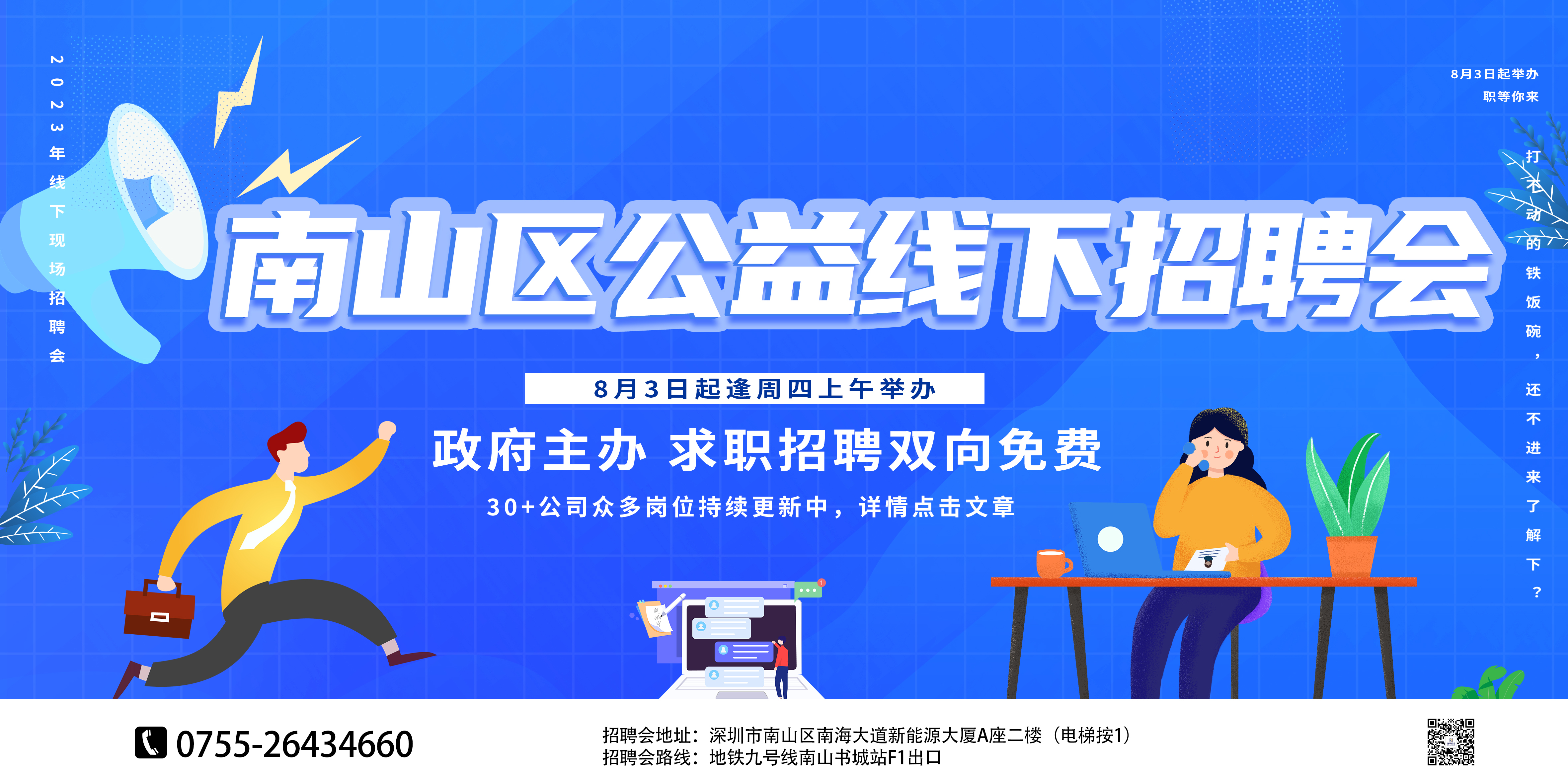 JOIN US现场招聘会启动8.17周四举办招聘会信息南山区公益线下现场招聘会政府主办 求职招聘双向免费01招聘会时间每周四上午9:00-12:0002招聘会地址 深圳市南山区南海大道新能源大厦A座二楼(电梯按1) 路线:地铁九号线...